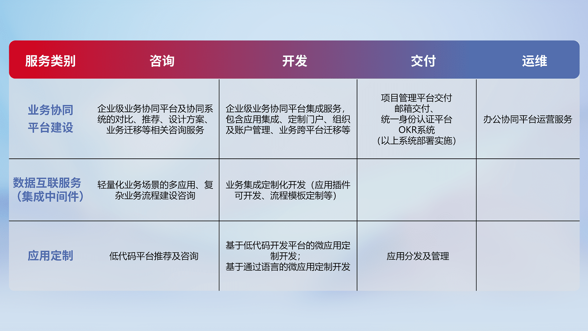 针对钉钉、、企微、、、IDaas等平台级产品提供产品的规划、、方案、、、、交付、、、定制化开发等服务,,,,实现如统一协同办公、、、、智能客户服务、、、混合会议管理、、智能数据查询、、等业务场景,,,,实现数字化转型。。