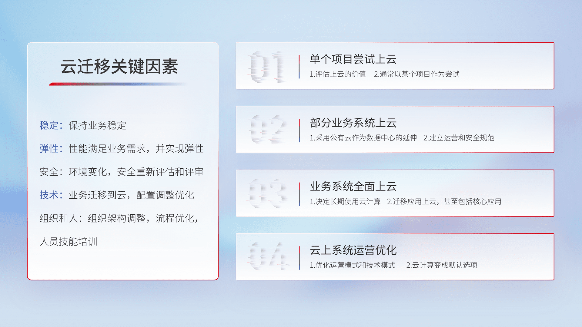 结合实际业务,,从规划设计、、云平台选型、、、、云原生改造、、数据迁移、、、、集成交付,,,,迁移全过程为客户识别最佳上云路径,,,,做好风险识别管理,,,,设计网络架构、、、身份权限、、安全审计合规、、、、操作审计、、、日志审计、、监控告警策略、、、多站点容灾设计等,,,对云上基础设施进行整体规划,,,,提升IT治理水平,,以满足弹性、、高可用、、、、高性能的需求。。。。