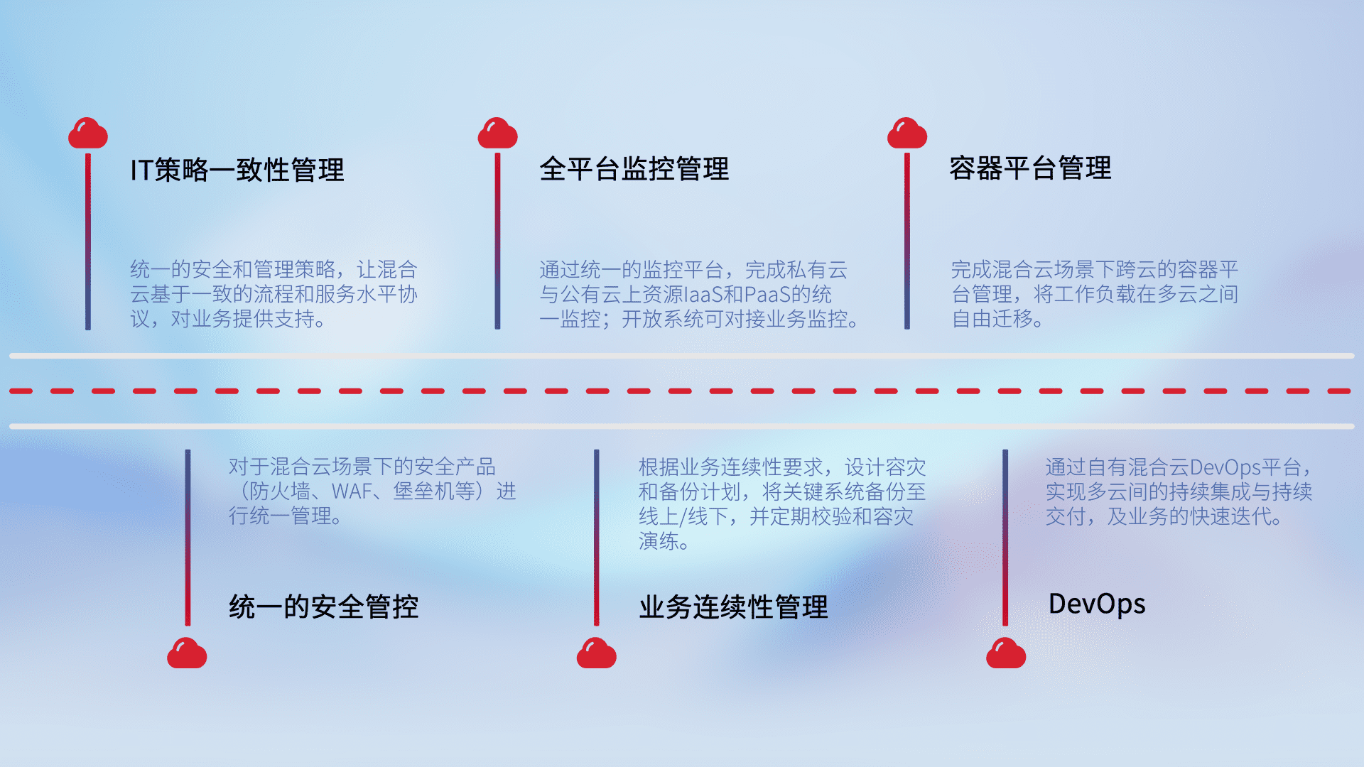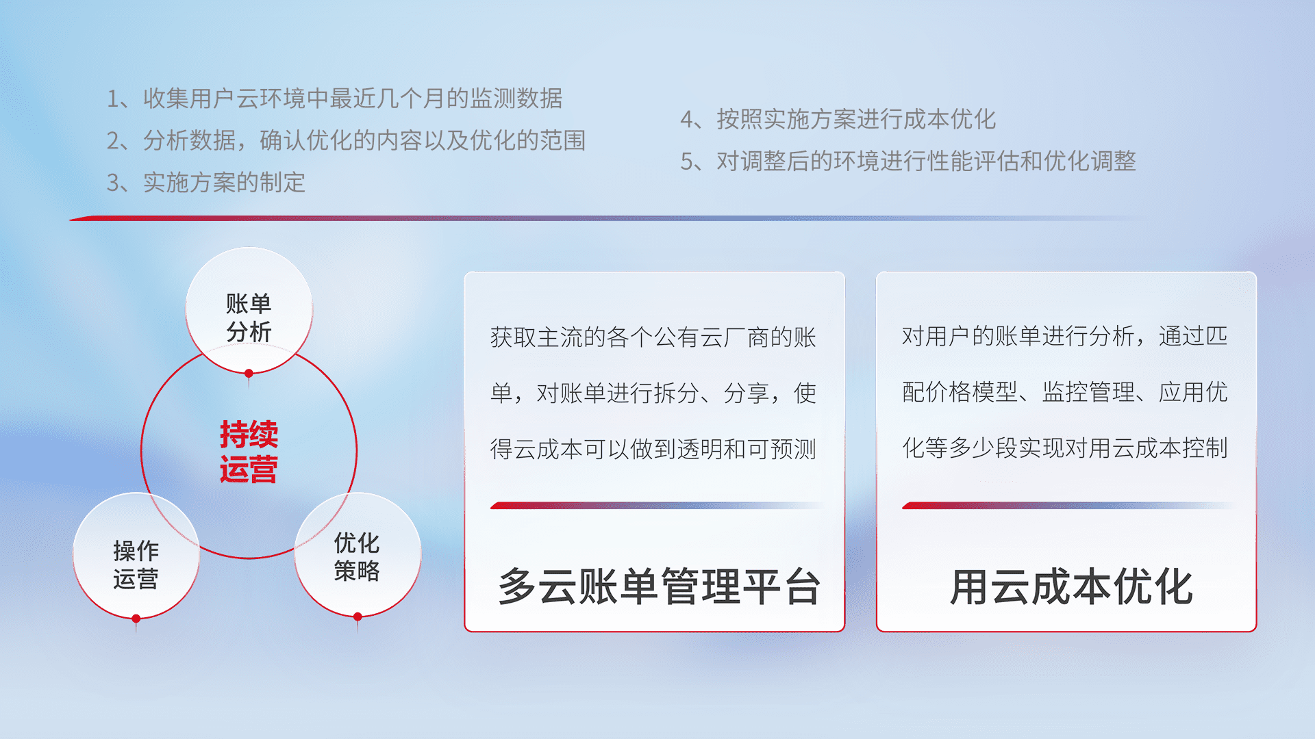 通过多云纳管,,,,以统一的资源数据模型把客户的云资源进行抽象和封装,,进而实现对多云资源的统一操作,,保障云资源管理的可靠性、、、、稳定性与可用性。。。量身定制化运维内容,,,配置、、开发运维、、、补丁管理、、、备份、、监控、、、认证和访问管理、、审计和日常巡检等,,,保障在用云过程中的可靠度,,,,稳定度以及高可用率。。。