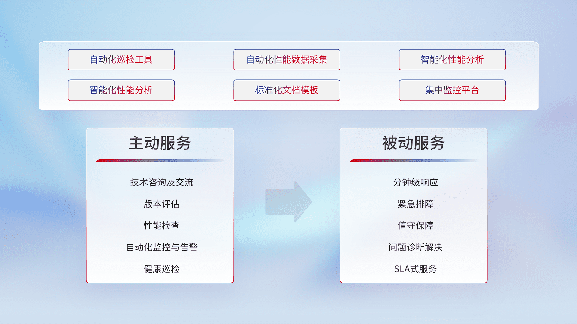 智能化工具和标准化文档,,保障服务质量,,,提供主动服务(包含技术咨询、、、、版本评估、、性能检查、、自动化监控与告警、、、健康巡检)和被动服务包含(分钟级响应、、、紧急排障、、值守保障、、、问题诊断解决、、SLA服务)。。。。