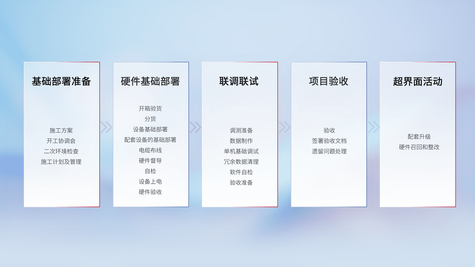 从基础部署准备、、、、硬件基础部署、、、、联调联试、、项目验收、、越界面活动的全过程可追溯,,保证施工质量和进度。。。